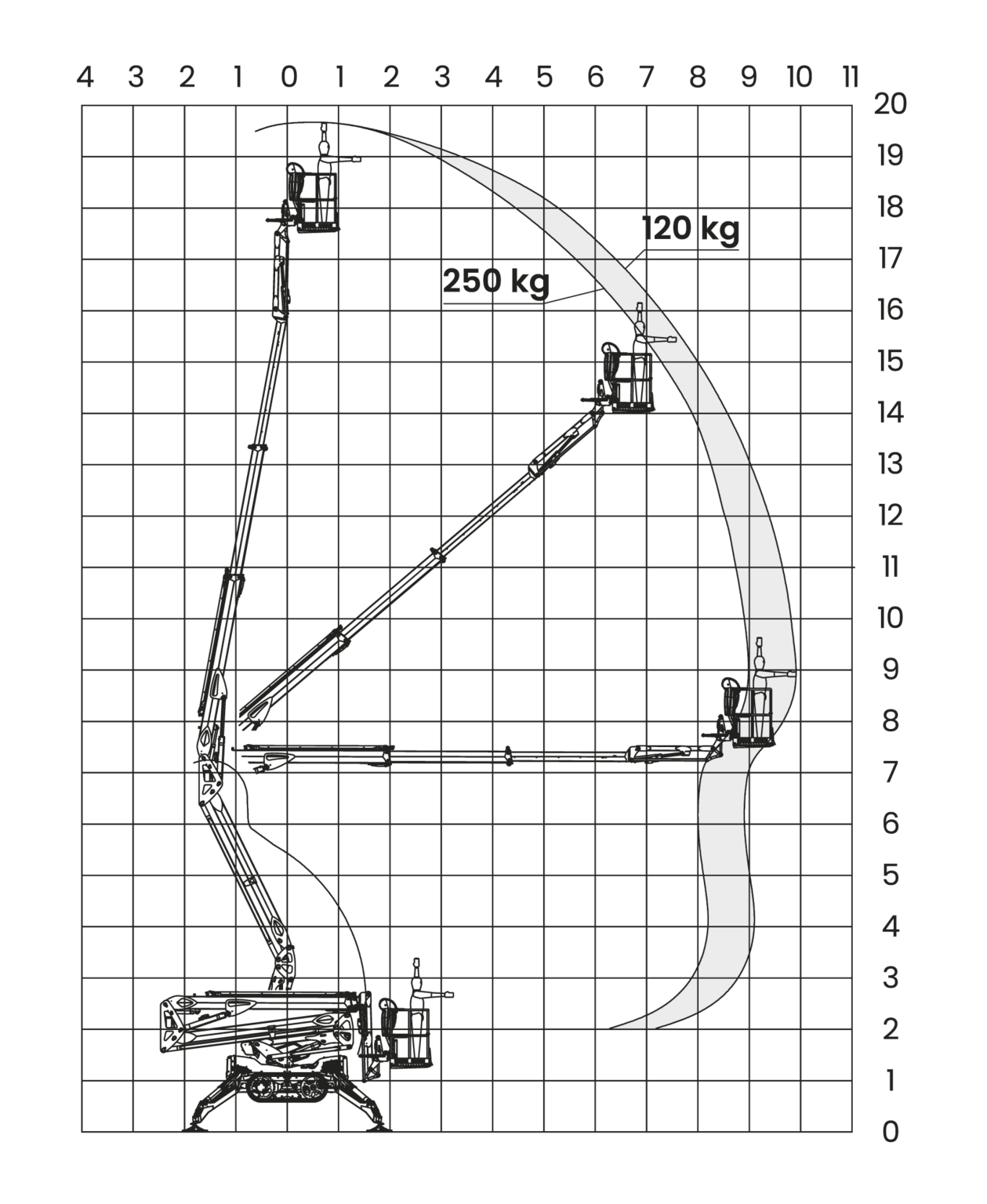| Max. seitliche Reichweite | 9,0 m (250 kg) – 9,9 m (120 kg) |